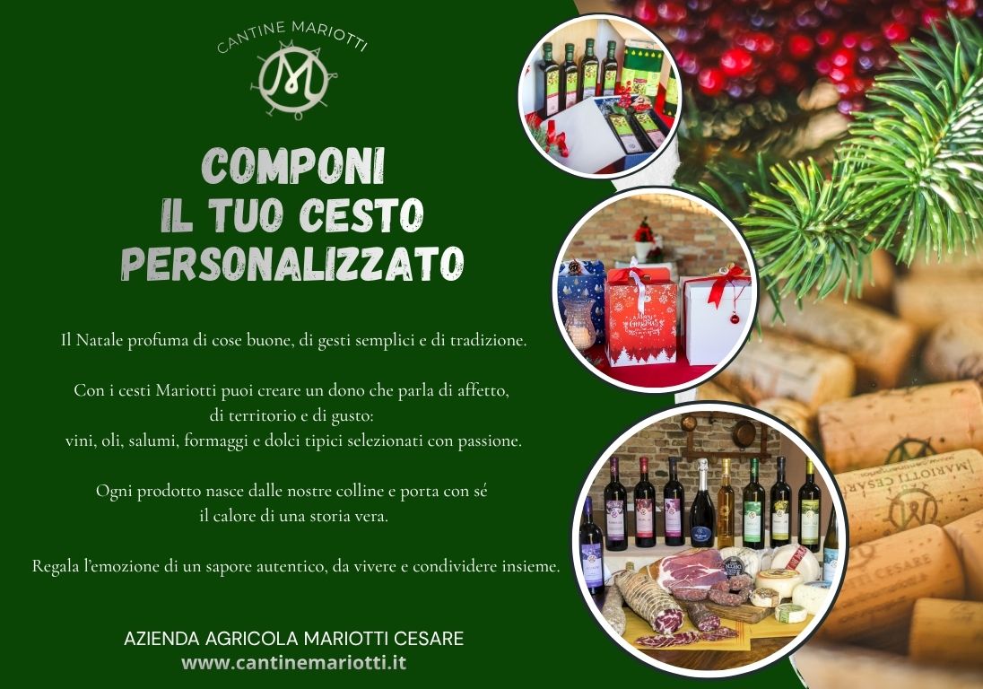 Cantine Mariotti ti invita a scoprire una vasta selezione di prodotti locali: vini pregiati, oli extravergine d’oliva, formaggi, salumi e dolci artigianali, racchiusi in eleganti cesti in vimini, terrecotte e porcellana bianca.